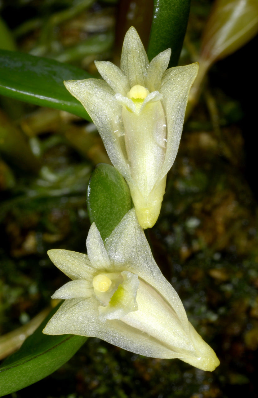 Similar to Dendrobium pachyphyllum, but the flowers are nearly pure white, with some yellow on the lip.