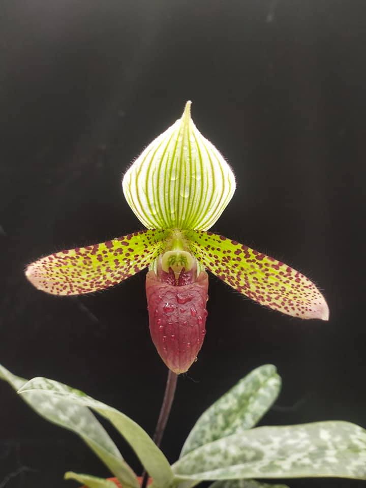 This hybrid is a cross of venustum x sukhakulii. It prefers intermediate-warm conditions, bright diffused light, and should be kept drier in the winter.